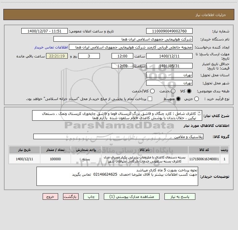 استعلام کاتلری شامل : کارد چنگال و قاشق بزرگ کریستال فوما و قاشق چایخوری کریستال ونمک ، دستمال نپکین ، خلال دندان با پوشش کاغذی اقلام سلفون شده با آرم هما , استعلام کاتلری شامل : کارد چنگال و قاشق بزرگ کریستال فوما و قاشق چایخوری کریستال ونمک ، دستمال نپکین ، خلال دندان با پوشش کاغذی اقلام سلفون شده با آرم هما