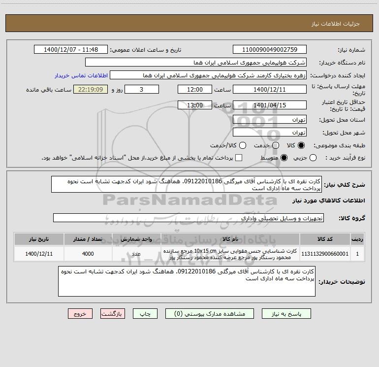 شرح کلی نیاز: کارت نقره ای با کارشناس آقای میرگلی 09122010186. هماهنگ شود ایران کدجهت تشابه است نحوه پرداخت سه ماه اداری است