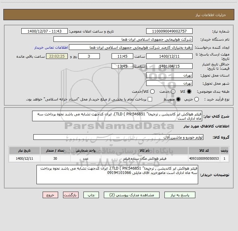 شرح کلی نیاز: فیلتر هواکش ایر کاندیشن , ترجیحا" TLD ( PN:546851). ایران کدجهت تشابه می باشد نحوه پرداخت سه ماه اداری است