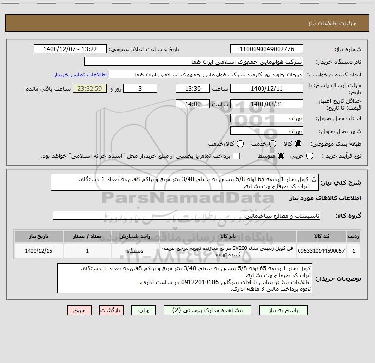 شرح کلی نیاز: کویل بخار 1 ردیفه 65 لوله 5/8 مسی به سطح 3/48 متر مربع و تراکم 8فین.به تعداد 1 دستگاه.