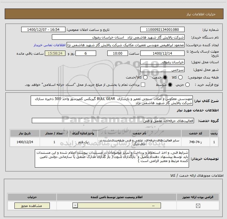 نام دستگاه خریدار:شرکت پالایش گاز شهید هاشمی نژاد استان خراسان رضوی