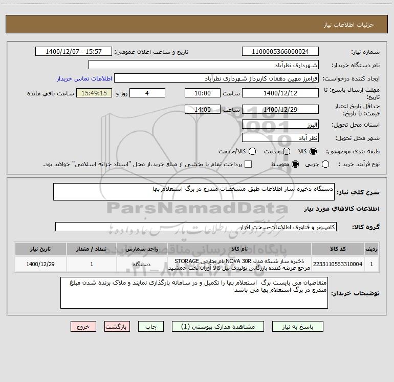 شرح کلی نیاز: دستگاه ذخیره ساز اطلاعات طبق مشخصات مندرج در برگ استعلام بها