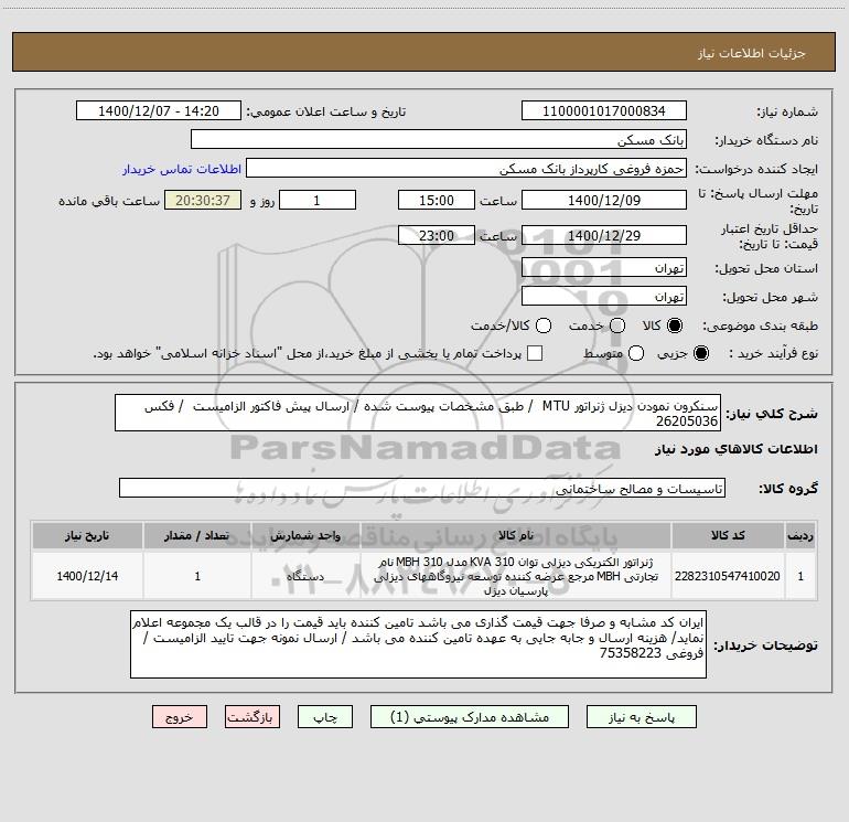 شرح کلی نیاز: سنکرون نمودن دیزل ژنراتور MTU / طبق مشخصات پیوست شده / ارسال پیش فاکتور الزامیست / فکس 26205036