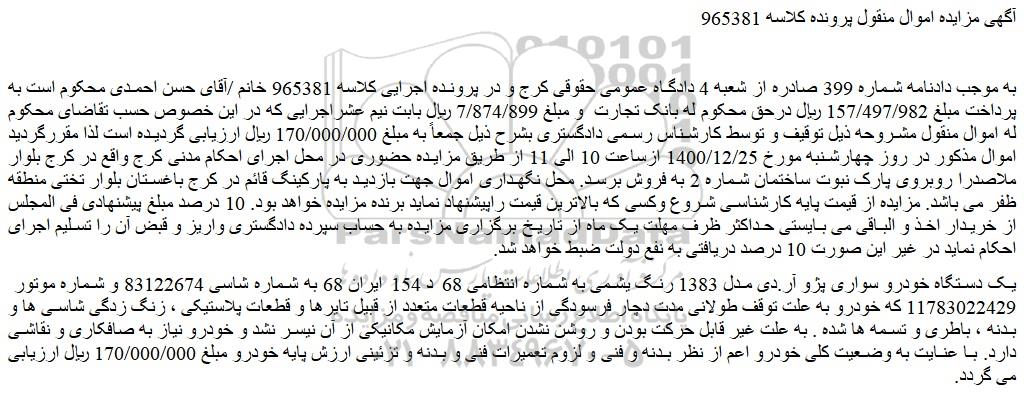 آگهی مزایده اموال منقول پرونده کلاسه 965381