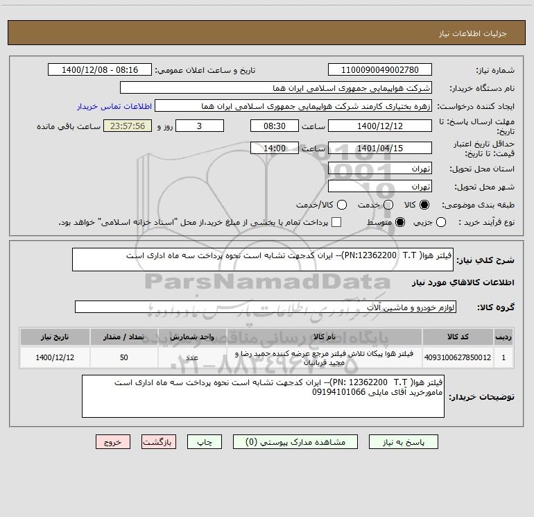 شرح کلی نیاز: فیلتر هوا( PN:12362200 T.T)-- ایران کدجهت تشابه است نحوه پرداخت سه ماه اداری است