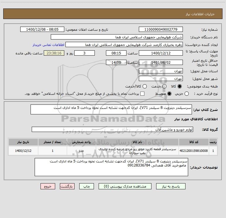 شرح کلی نیاز: سرسیلندر دیترویت 8 سیلندر V71). ایران کدجهت تشابه است نحوه پرداخت 5 ماه اداری است