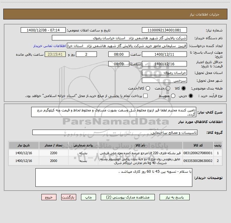 نام دستگاه خریدار:شرکت پالایش گاز شهید هاشمی نژاد استان خراسان رضوی