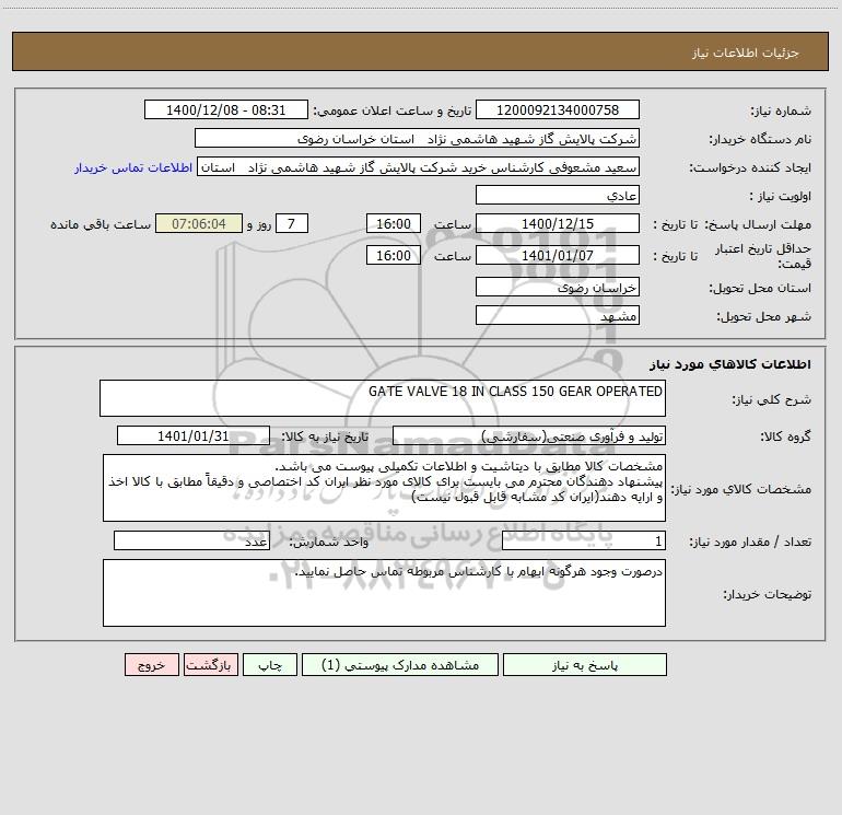 نام دستگاه خریدار:شرکت پالایش گاز شهید هاشمی نژاد استان خراسان رضوی