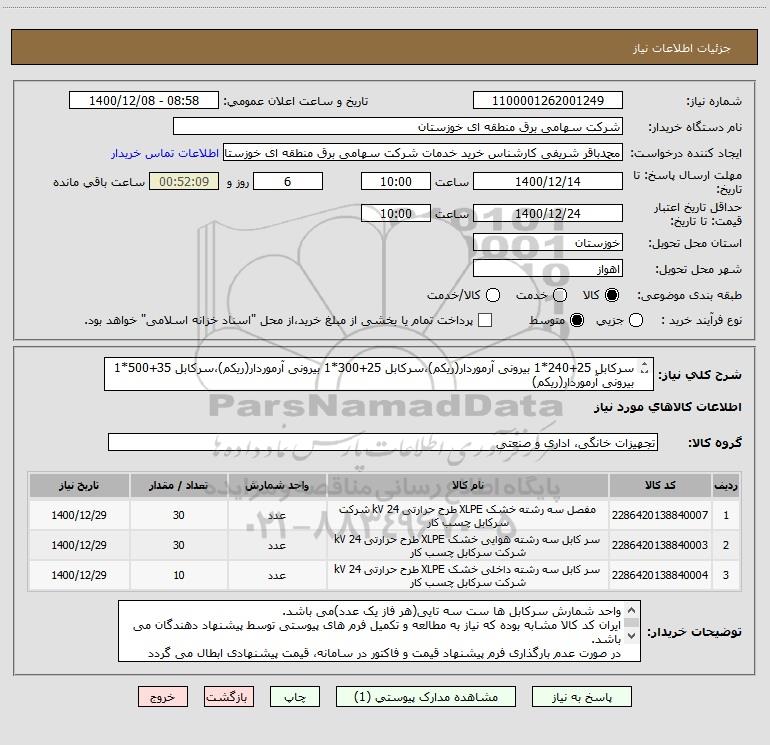 شرح کلی نیاز: سرکابل 25+240*1 بیرونی آرموردار(ریکم)،سرکابل 25+300*1 بیرونی آرموردار(ریکم)،سرکابل 35+500*1 بیرونی آرموردار(ریکم)