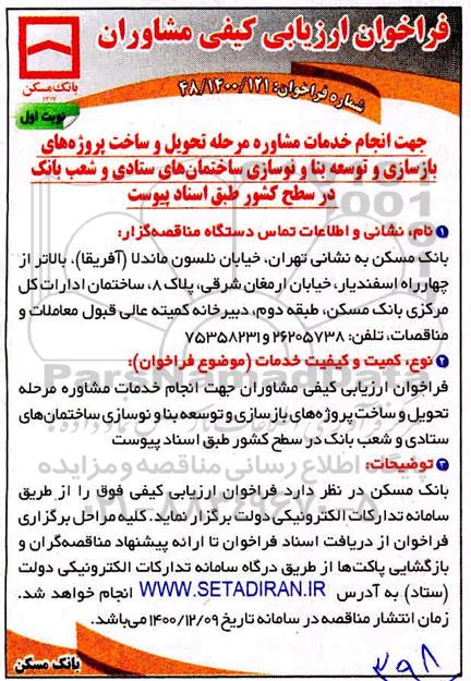 فراخوان ارزیابی کیفی مشاوران جهت انجام خدمات مشاوره مرحله تحویل و ساخت پروژه های بازسازی و توسعه بنا و نوسازی ساختمان های ستادی و شعب بانک در سطح کشور طبق اسناد پیوست