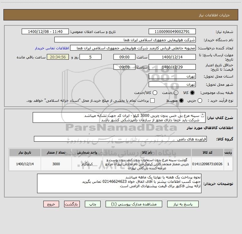 شرح کلی نیاز: سینه مرغ بی خس بدون چربی 3000 کیلو - ایران کد جهت تشابه میباشد