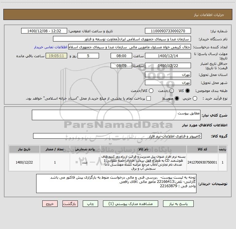 نام دستگاه خریدار: سازمان صدا و سیمای جمهوری اسلامی ایران(معاونت توسعه و فناور