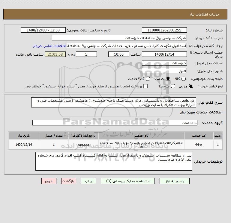 شرح کلی نیاز: رفع نواقص ساختمانی و تاًسیساتی مرکز دیسپاچینگ ناحیه جنوبشرق ( ماهشهر ) طبق مشخصات فنی و شرایط پیوست همراه با سایت ویزیت .