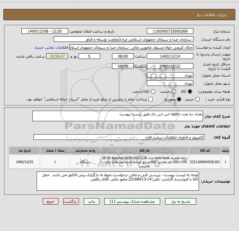 شرح کلی نیاز: تعداد ده عدد حافظه اس اس دی طبق لیست پیوست