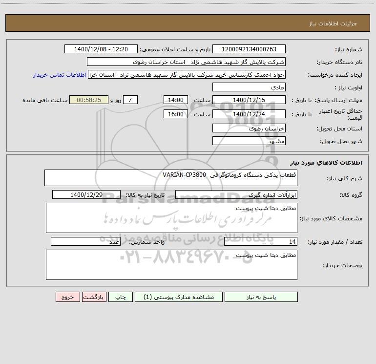 نام دستگاه خریدار:شرکت پالایش گاز شهید هاشمی نژاد استان خراسان رضوی