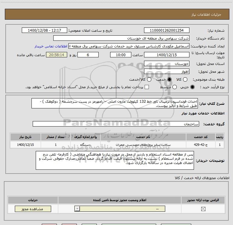 شرح کلی نیاز: احداث فونداسیون ترمینال تاور خط 132 کیلوولت مارون اصلی – رامهرمز در پست سرچشمه ( دوکوهک ) - طبق شرایط و آنالیز پیوست.