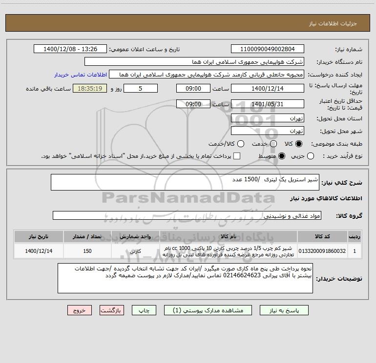 شرح کلی نیاز: شیر استریل یک لیتری /1500 عدد