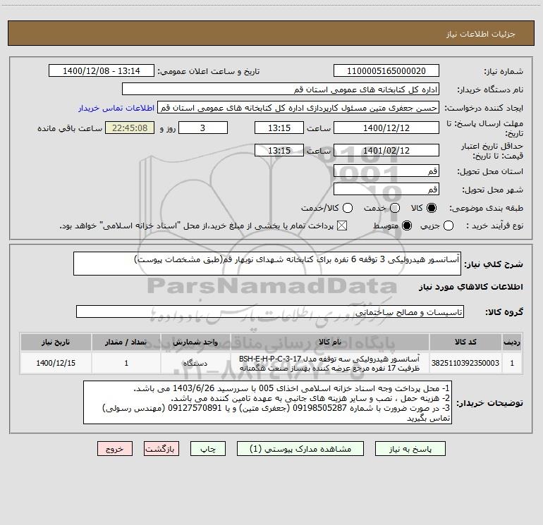 شرح کلی نیاز: آسانسور هیدرولیکی 3 توقفه 6 نفره برای کتابخانه شهدای نوبهار قم(طبق مشخصات پیوست)