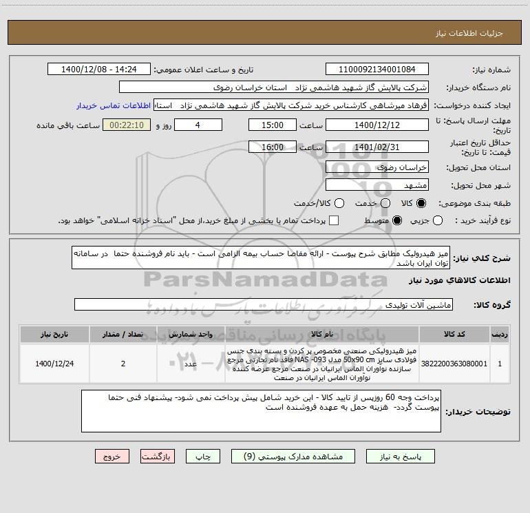 نام دستگاه خریدار:شرکت پالایش گاز شهید هاشمی نژاد استان خراسان رضوی