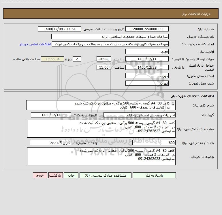 مشخصات کالای مورد نیاز: کاغذ A4 80 گرمی - بسته 500 برگی - مطابق ایران کد ثبت شده