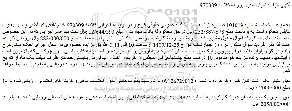 آگهی مزایده اموال منقول پرونده کلاسه 970309