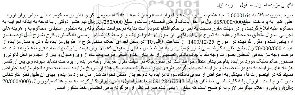 بموجب پرونده کلاسه 0000164 شعبه هشتم اجرا و دادنامه و اجراییه صادره از شعبه 1 دادگاه عمومی  کرج  دائر بر محکومیت علی عباس بران فرزند علی اکبر به پرداخت  مبلغ665/000/000 ریال در حق بانک قرض الحسنه رسالت و مبلغ 33/250/000 ریال نیم عشر دولتی . با توجه به اینکه اجراییه به محکوم علیه ابلاغ گردیده و در مهلت مقرر نسبت به اجرای حکم اقدام ننموده است بنا به درخواست محکوم له و به منظور استیفای  محکوم به و هزینه های اجرایی  اموال متعلق به محکوم علیه  به شرح ذیل این اگهی  از سوی این اجرا توقیف و توسط کارشناس رسمی دادگستری کرج بشرح ذیل توصیف و ارزیابی شده و مقرر گردیده در  مورخ  1400/12/25  از ساعت  9الی 10  در محل اجرای احکام مدنی کرج از طریق مزایده بفروش برسد. مزایده از قیمت 70/000/000 ریال طبق نظریه کارشناسی شروع میشود و به هر شخص حقیقی و حقوقی که بالاترین قیمت را پیشنهاد نماید فروخته خواهد شد. ده درصد وجه مزایده فی المجلس بصورت وجه نقد یا چک بانکی تضمینی از خریدار اخذ و الباقی ظرف یک ماه از وی وصول و پس از انجام مراحل قانونی و صدور حکم تملیک مورد مزایده بنام خریدار منتقل خواهد شد. در صورتیکه در مهلت مقرر خریدار وجه مزایده را پرداخت ننماید سپرده وی پس از کسر هزینه های مزایده به نفع دولت ضبط و مزایده تجدید میگردد. طرفین میتوانند ظرف مدت یک هفته از تاریخ مزایده نسبت به نحوه انجام مزایده اعتراض نمایند که در اینصورت تا رسیدگی به اعتراض از سوی دادگاه مورد مزایده به نام خریدار منتقل نخواهد شد.  مال مورد مزایده و بهای آن طبق نظر کارشناس بدین شرح است:  ارزش پایه کارشناسی خط تلفن همراه  09128467747 خط همراه اول دائمی تهران کارکرده  به مبلغ هفتاد میلیون ریال (70/000/000 ریال)ارزیابی و اعلام میگردد. لازم به توضیح است که مبلغ ارزیابی شده صرف نظر از هرگونه بدهی احتمالی خط مذکور است.