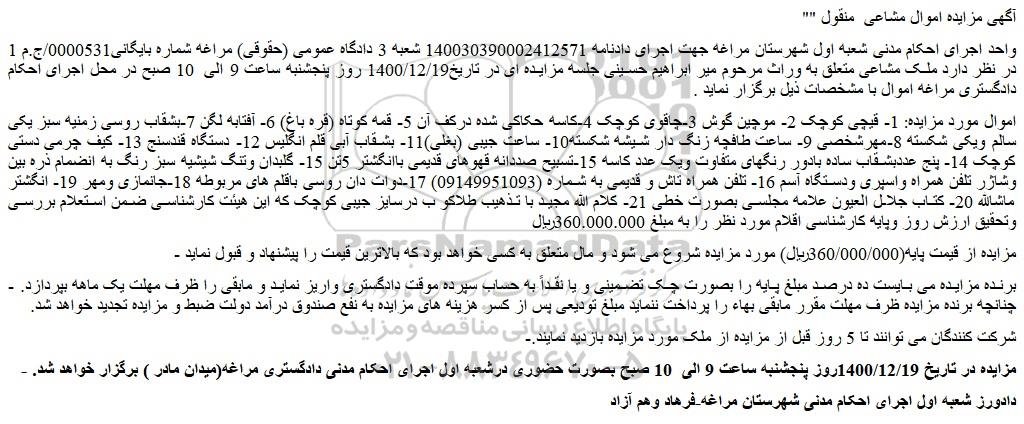 اموال مورد مزایده: 1- قیچی کوچک 2- موچین گوش 3-چاقوی کوچک 4-کاسه حکاکی شده درکف آن 5- قمه کوتاه (قره باغ) 6- آفتابه لگن 7-بشقاب روسی زمنیه سبز یکی سالم ویکی شکسته 8-مهرشخصی 9- ساعت طافچه زنگ دار شیشه شکسته10- ساعت جیبی (بغلی)11- بشقاب آبی قلم انگلیس 12- دستگاه قندسنج 13- کیف چرمی دستی کوچک 14- پنج عددبشقاب ساده بادور رنگهای متفاوت ویک عدد کاسه 15-تسبیح صددانه قهوهای قدیمی باانگشتر 5تن 15- گلبدان وتنگ شیشیه سبز رنگ به انضمام ذره بین وشاژر تلفن همراه واسپری ودستگاه آسم 16- تلفن همراه تاش و قدیمی به شماره (09149951093) 17-دوات دان روسی باقلم های مربوطه 18-جانمازی ومهر 19- انگشتر ماشالله 20- کتاب جلال العیون علامه مجلسی بصورت خطی 21- کلام الله مجید با تذهیب طلاکو ب درسایز جیبی کوچک که این هیئت کارشناسی ضمن استعلام بررسی وتحقیق ارزش روز وپایه کارشناسی اقلام مورد نظر را به مبلغ 360.000.000ریال