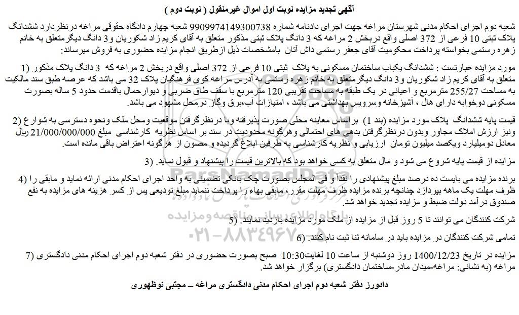 آگهی تجدید مزایده نوبت اول اموال غیرمنقول ( نوبت دوم )