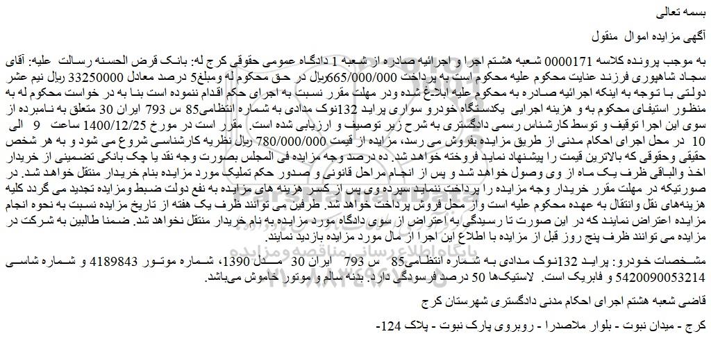 به موجب پرونده کلاسه 0000171 شعبه هشتم اجرا و اجرائیه صادره از شعبه 1 دادگاه عمومی حقوقی کرج له: بانک قرض الحسنه رسالت علیه: آقای سجاد شاهپوری فرزند عنایت محکوم علیه محکوم است به پرداخت 665/000/000ریال در حق محکوم له ومبلغ5 درصد معادل 33250000 ریال نیم عشر دولتی با توجه به اینکه اجرائیه صادره به محکوم علیه ابلاغ شده ودر مهلت مقرر نسبت به اجرای حکم اقدام ننموده است بنا به در خواست محکوم له به منظور استیفای محکوم به و هزینه اجرایی یکدستگاه خودرو سواری پراید 132نوک مدادی به شماره انتظامی85 س 793 ایران 30 متعلق به نامبرده از سوی این اجرا توقیف و توسط کارشناس رسمی دادگستری به شرح زیر توصیف و ارزیابی شده است. مقرر است در مورخ 1400/12/25 ساعت 9 الی 10 در محل اجرای احکام مدنی از طریق مزایده بفروش می رسد، مزایده از قیمت 780/000/000 ریال نظریه کارشناسی شروع می شود و به هر شخص حقیقی وحقوقی که بالاترین قیمت را پیشنهاد نماید فروخته خواهد شد. ده درصد وجه مزایده فی المجلس بصورت وجه نقد یا چک بانکی تضمینی از خریدار اخذ والباقی ظرف یک ماه از وی وصول خواهد شد و پس از انجام مراحل قانونی و صدور حکم تملیک مورد مزایده بنام خریدار منتقل خواهد شد. در صورتیکه در مهلت مقرر خریدار وجه مزایده را پرداخت ننماید سپرده وی پس از کسر هزینه های مزایده به نفع دولت ضبط ومزایده تجدید می گردد کلیه هزینه های نقل وانتقال به عهده محکوم علیه است واز محل فروش پرداخت خواهد شد. طرفین می توانند ظرف یک هفته از تاریخ مزایده نسبت به نحوه انجام مزایده اعتراض نمایند که در این صورت تا رسیدگی به اعتراض از سوی دادگاه مورد مزایده به نام خریدار منتقل نخواهد شد. ضمنا طالبین به شرکت در مزایده می توانند ظرف پنج روز قبل از مزایده با اطلاع این اجرا از مال مورد مزایده بازدید نمایند.