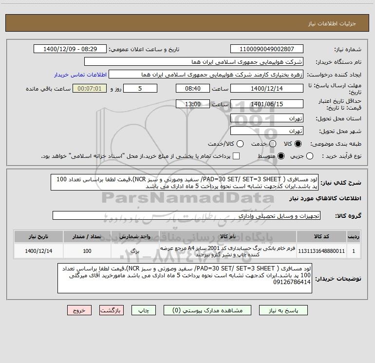 شرح کلی نیاز: لود مسافری ( PAD=30 SET/ SET=3 SHEET/ سفید وصورتی و سبز NCR).قیمت لطفا براساس تعداد 100 پد باشد.ایران کدجهت تشابه است نحوه پرداخت 5 ماه اداری می باشد