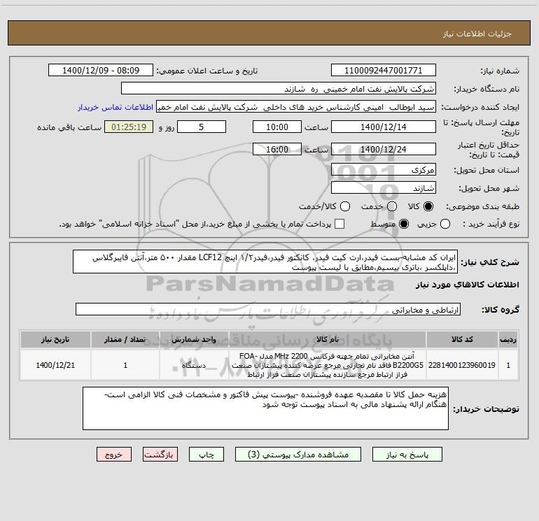 شرح کلی نیاز: ایران کد مشابه-بست فیدر،ارت کیت فیدر، کانکتور فیدر،فیدر۱/۲ اینچ LCF12 مقدار ۵۰۰ متر،آنتن فایبرگلاس ،داپلکسر ،باتری بیسیم،مطابق با لیست پیوست