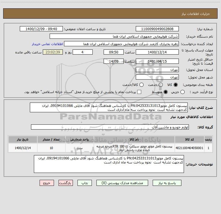 شرح کلی نیاز: پیستون کامل موتورPN:042533131013 با کارشناس هماهنگ شود آقای مایلی 09194101066. ایران کدجهت تشابه است نحوه پرداخت سه ماه اداری است