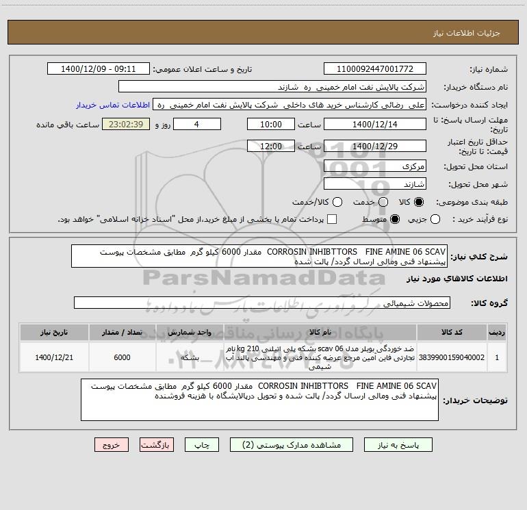 شرح کلی نیاز: CORROSIN INHIBTTORS FINE AMINE 06 SCAV مقدار 6000 کیلو گرم مطابق مشخصات پیوست پیشنهاد فنی ومالی ارسال گردد/ پالت شده