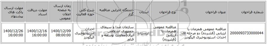 | 2000093733000044 | مناقصه عمومی همزمان با ارزیابی (فشرده) دو مرحله ای احداث استودیوخبری الیگودرز | مناقصه عمومی همزمان با ارزیابی (فشرده) | لرستان | سازمان صدا و سیمای جمهوری اسلامی ایران(معاونت توسعه و فناور | احداث استودیوخبری الیگودرز | 1400/12/09 08:00:00 | 1400/12/16 16:00:00 | 1400/12/26 16:00:00 |