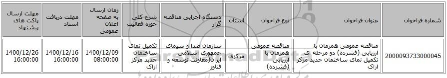 | 2000093733000045 | مناقصه عمومی همزمان با ارزیابی (فشرده) دو مرحله ای تکمیل نمای ساختمان جدید مرکز اراک | مناقصه عمومی همزمان با ارزیابی (فشرده) | مرکزی | سازمان صدا و سیمای جمهوری اسلامی ایران(معاونت توسعه و فناور | تکمیل نمای ساختمان جدید مرکز اراک | 1400/12/09 08:00:00 | 1400/12/16 16:00:00 | 1400/12/26 16:00:00 |