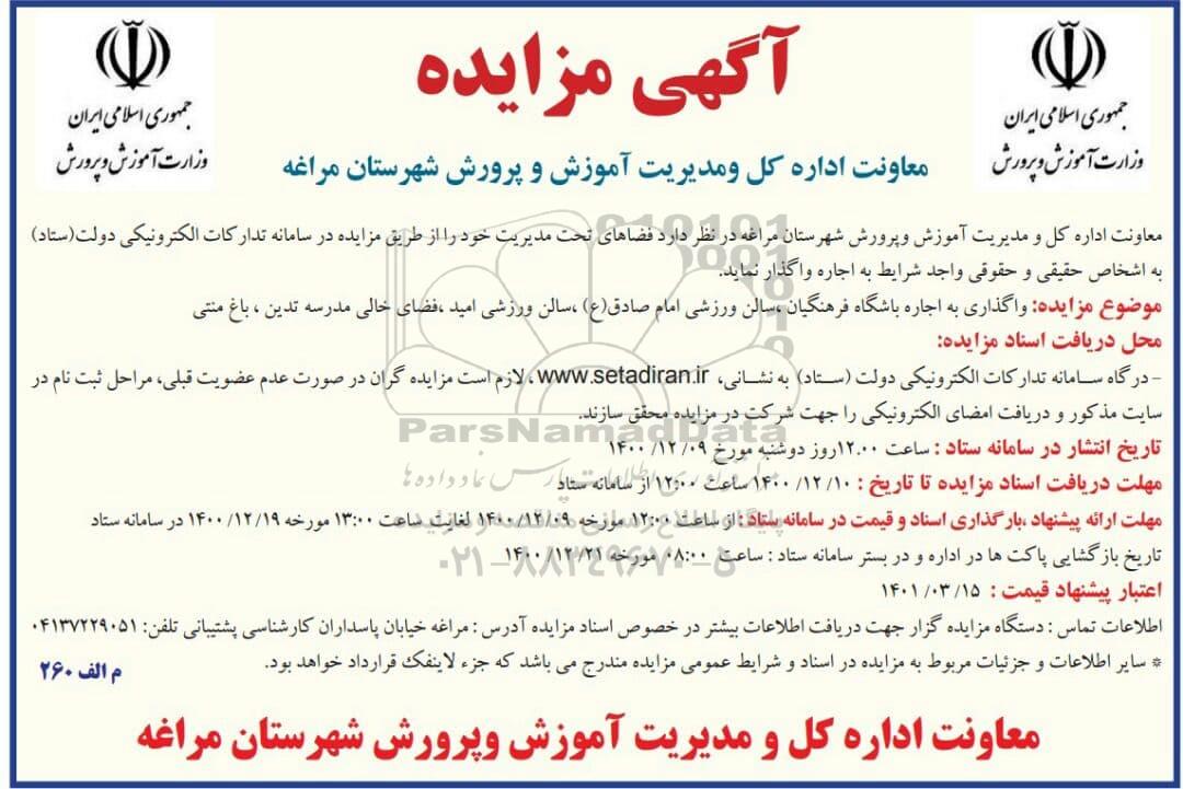 معاونت اداره کل و مدیریت آموزش و پرورش شهرستان مراغه در نظر دارد فضاهای تحت مدیریت خود را طریق مزایده و سامانه تدارکات الکترونیکی دولت ستاد به اشخاص حقیقی و حقوقی واجد شرایط به اجاره واگذار نماید.