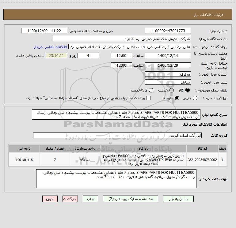 شرح کلی نیاز: SPARE PARTS FOR MULTI EA5000 تعداد 7 قلم / مطابق مشخصات پیوست پیشنهاد فنی ومالی ارسال گردد/ تحویل درپالایشگاه با هزینه فروشنده/ تعداد 7 عدد