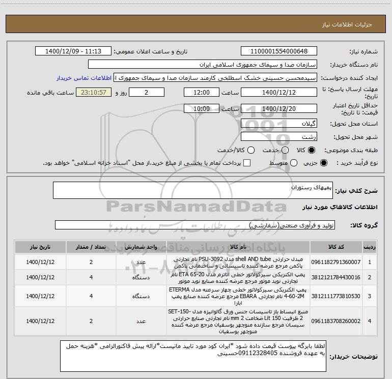 شرح کلی نیاز: پمپهای رستوران