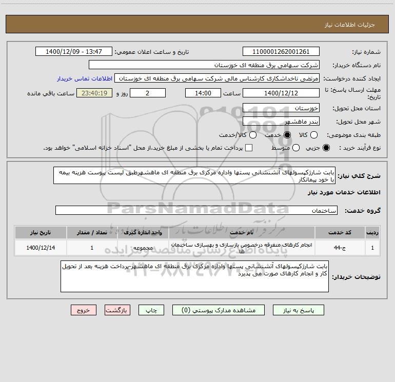 شرح کلی نیاز: بابت شارژکپسولهای آتشنشانی پستها واداره مرکزی برق منطقه ای ماهشهرطبق لیست پیوست هزینه بیمه با خود پیمانکار
