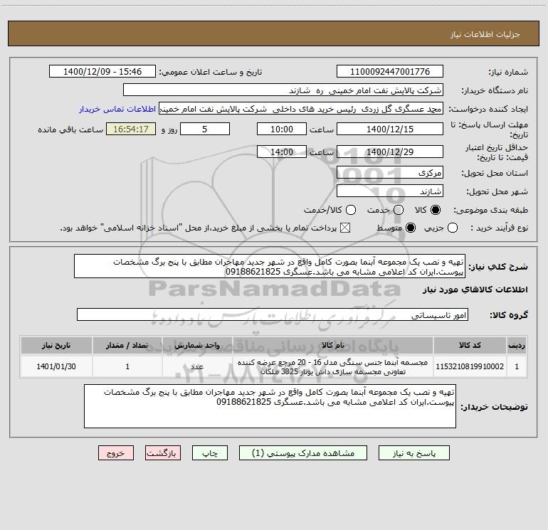 توضیحات خریدار:تهیه و نصب یک مجموعه آبنما بصورت کامل واقع در شهر جدید مهاجران مطابق با پنج برگ مشخصات پیوست.ایران کد اعلامی مشابه می باشد.عسگری 09188621825