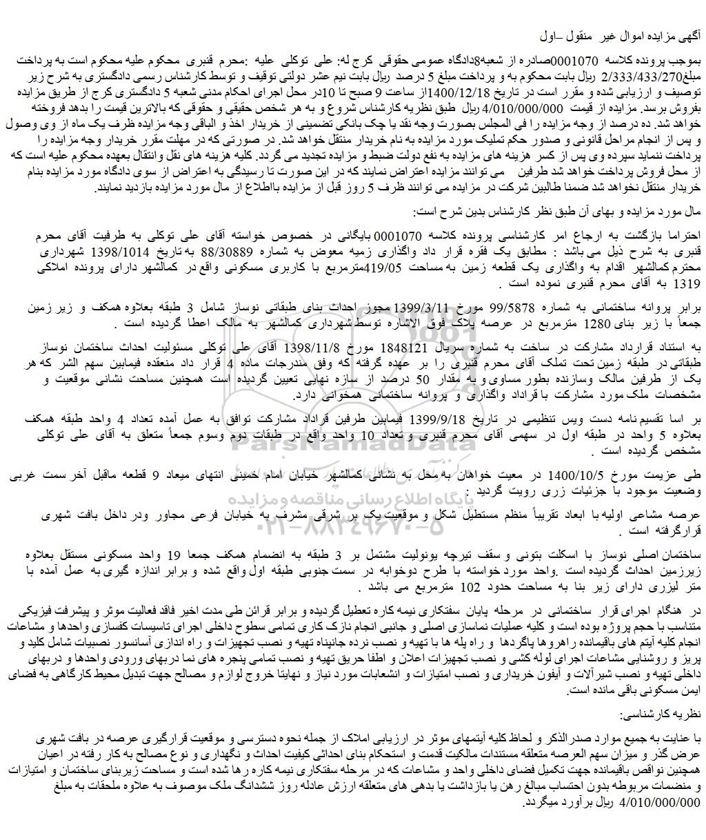 بموجب پرونده کلاسه  0001070صادره از شعبه8دادگاه عمومی حقوقی  کرج له: علی  توکلی  علیه  :محرم  قنبری  محکوم علیه محکوم است به پرداخت مبلغ2/333/433/270  ریال بابت محکوم به و پرداخت مبلغ 5 درصد  ریال بابت نیم عشر دولتی توقیف و توسط کارشناس رسمی دادگستری به شرح زیر توصیف و ارزیابی شده و مقرر است در تاریخ 1400/12/18از ساعت 9 صبح تا 10در محل اجرای احکام مدنی شعبه 5 دادگستری کرج از طریق مزایده بفروش برسد. مزایده از قیمت  4/010/000/000 ریال  طبق نظریه کارشناس شروع و به هر شخص حقیقی و حقوقی که بالاترین قیمت را بدهد فروخته خواهد شد. ده درصد از وجه مزایده را فی المجلس بصورت وجه نقد یا چک بانکی تضمینی از خریدار اخذ و الباقی وجه مزایده ظرف یک ماه از وی وصول و پس از انجام مراحل قانونی و صدور حکم تملیک مورد مزایده به نام خریدار منتقل خواهد شد. در صورتی که در مهلت مقرر خریدار وجه مزایده را پرداخت ننماید سپرده وی پس از کسر هزینه های مزایده به نفع دولت ضبط و مزایده تجدید می گردد. کلیه هزینه های نقل وانتقال بعهده محکوم علیه است که از محل فروش پرداخت خواهد شد طرفین    می توانند مزایده اعتراض نمایند که در این صورت تا رسیدگی به اعتراض از سوی دادگاه مورد مزایده بنام خریدار منتقل نخواهد شد ضمنا طالبین شرکت در مزایده می توانند ظرف 5 روز قبل از مزایده بااطلاع از مال مورد مزایده بازدید نمایند.