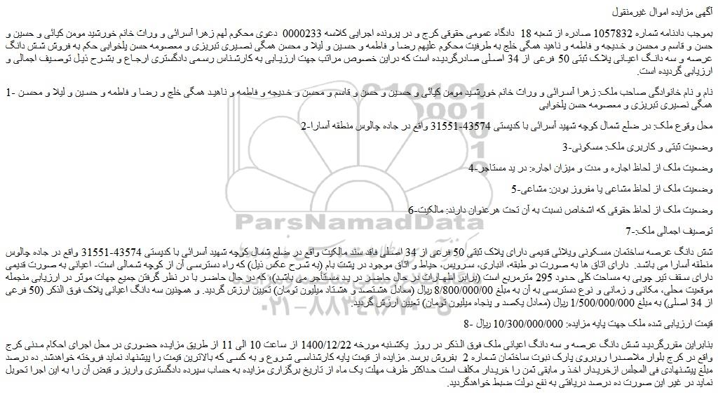 بموجب دادنامه شماره 1057832 صادره از شعبه 18 دادگاه عمومی حقوقی کرج و در پرونده اجرایی کلاسه 0000233 دعوی محکوم لهم زهرا آسرائی و وراث خانم خورشید مومن کیائی و حسین و حسن و قاسم و محسن و خدیجه و فاطمه و ناهید همگی خلج به طرفیت محکوم علیهم رضا و فاطمه و حسین و لیلا و محسن همگی نصیری تبریزی و معصومه حسن پلخوابی حکم به فروش شش دانگ عرصه و سه دانگ اعیانی پلاک ثبتی 50 فرعی از 34 اصلی صادرگردیده است که دراین خصوص مراتب جهت ارزیابی به کارشناس رسمی دادگستری ارجاع و بشرح ذیل توصیف اجمالی و ارزیابی گردیده است.