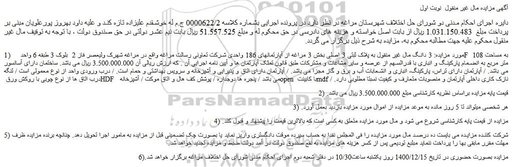 1) مورد مزایده: 3 دانگ مال غیر منقول به پلاک ثبتی 3 اصلی بخش 3 مراغه از آپارتمانهای 186 واحدی شرکت تعاونی رسالت مراغه واقع در مراغه شهرک ولیعصر فاز 2 بلوک 3 طبقه 6 واحد F به مساحت 108 متر مربع به انضمام پارکینگ و انباری با قدرالسهم از عرصه و سایر مشاعات و مشترکات طبق قانون تملک آپارتمان ها و آیین نامه اجرایی آن . که ارزش ریالی آن 3.500.000.000 ریال می باشد. ساختمان دارای آسانسور می باشد. / آپارتمان دارای تراس، پارکینگ، انباری و انشعابات آب و برق و گاز مجزا می باشد. / آپارتمان دارای اتاق و پذیرایی و آشپزخانه و سرویس بهداشتی و حمام است. / درب ورودی واحد از نوع معمولی است / لنگه درب اتاق ها از نوع چوبی با روکش ورق HDF می باشد / پنجره ها دوجداره / پوشش کف هال و اتاق موکت / آشپزخانه open با کابینت mdf / نازک کاری داخلی آپارتمان و منصوبات متعارف و کیفیت نسبتا مطلوبی دارد.