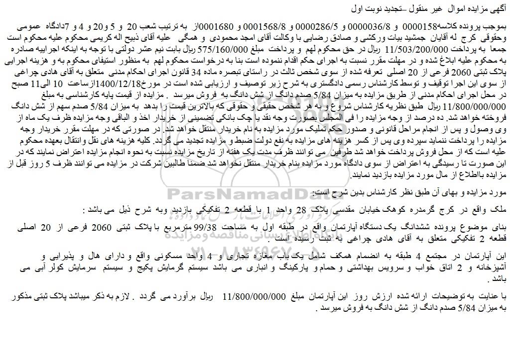 بموجب پرونده کلاسه0000158  و 0000036/8 و 0000286/5 و 0001568/8 و 0001680از  به ترتیب شعب 20  و 5 و20 و 4 و 7دادگاه  عمومی وحقوقی  کرج  له آقایان  جمشید بیات ورکشی و صادق رضایی با وکالت آقای امجد محمودی  و همگی   علیه آقای ذبیح اله کریمی محکوم علیه محکوم است جمعا  به پرداخت 11/503/200/000  ریال در حق محکوم لهم  و پرداخت  مبلغ 575/160/000 ریال بابت نیم عشر دولتی با توجه به اینکه اجراییه صادره به محکوم علیه ابلاغ شده و در مهلت مقرر نسبت به اجرای حکم اقدام ننموده است بنا به درخواست محکوم لهم  به منظور استیفای محکوم به و هزینه اجرایی پلاک ثبتی 2060 فرعی از 20 اصلی  تعرفه شده از سوی شخص ثالث در راستای تبصره ماده 34 قانون اجرای احکام مدنی  متعلق به آقای هادی چراغی  از سوی این اجرا توقیف و توسط کارشناس رسمی دادگستری به شرح زیر توصیف و ارزیابی شده است در مورخ1400/12/18ازساعت  10 الی11 صبح در محل اجرای احکام مدنی از طریق مزایده به میزان 5/84 صدم دانگ از شش دانگ به  فروش میرسد  . مزایده از قیمت پایه کارشناسی به مبلغ 11/800/000/000 ریال  طبق نظریه کارشناس شروع و به هر شخص حقیقی و حقوقی که بالاترین قیمت را بدهد  به میزان 5/84 صدم سهم از شش دانگ فروخته خواهد شد. ده درصد از وجه مزایده را فی المجلس بصورت وجه نقد یا چک بانکی تضمینی از خریدار اخذ و الباقی وجه مزایده ظرف یک ماه از وی وصول و پس از انجام مراحل قانونی و صدور حکم تملیک مورد مزایده به نام خریدار منتقل خواهد شد. در صورتی که در مهلت مقرر خریدار وجه مزایده را پرداخت ننماید سپرده وی پس از کسر هزینه های مزایده به نفع دولت ضبط و مزایده تجدید می گردد. کلیه هزینه های نقل وانتقال بعهده محکوم علیه است که از محل فروش پرداخت خواهد شد طرفین  می توانند ظرف مدت یک هفته از تاریخ مزایده نسبت به نحوه انجام مزایده اعتراض نمایند که در این صورت تا رسیدگی به اعتراض از سوی دادگاه مورد مزایده بنام خریدار منتقل نخواهد شد ضمنا طالبین شرکت در مزایده می توانند ظرف 5 روز قبل از مزایده بااطلاع از مال مورد مزایده بازدید نمایند.