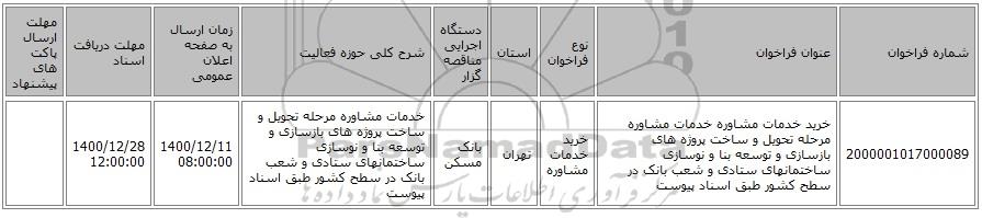 2000001017000089 | خرید خدمات مشاوره خدمات مشاوره مرحله تحویل و ساخت پروژه های بازسازی و توسعه بنا و نوسازی ساختمانهای ستادی و شعب بانک در سطح کشور طبق اسناد پیوست | خرید خدمات مشاوره | تهران | بانک مسکن | خدمات مشاوره مرحله تحویل و ساخت پروژه های بازسازی و توسعه بنا و نوسازی ساختمانهای ستادی و شعب بانک در سطح کشور طبق اسناد پیوست | 1400/12/11 08:00:00 | 1400/12/28 12:00:00 |