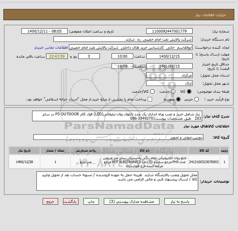 استعلام بها و موضوع استعلام استعلام نیاز شامل خرید و نصب وراه اندازی یک عدد تابلوی روان تبلیغاتی(LED) فول کالر P5 OUTDOOR در سایز 2X3 طبق مشخصات پیوست33492701-086 به اطلاع کلیه شرکتها و افراد متخصص واجد شرایط میرساند، آگهی گذار در نظر دارد از طریق استعلام بها، نسبت به انتخاب و دریافت پیشنهادات اقدام نماید. این استعلام با کد آگهی ثبت شده در سامانه خبرگزاری پارس نماد : 4314291 منتشر شده است. مشخصات استعلام : تاریخ شروع استعلام: 1400/12/11 آخرین مهلت ارسال پیشنهاد قیمت : 1400/12/14 و محل اجرای پروژه : استان مرکزی میباشد. استعلام قیمت مورد درخواست : استعلام نیاز شامل خرید و نصب وراه اندازی یک عدد تابلوی روان تبلیغاتی(LED) فول کالر P5 OUTDOOR در سایز 2X3 طبق مشخصات پیوست33492701-086 با دستهبندیهای تخصصی و گروه های مرتبط : تابلو دیجیتال, طراحی چاپ و تبلیغات, استعلام اطلاع رسانی میگردد.