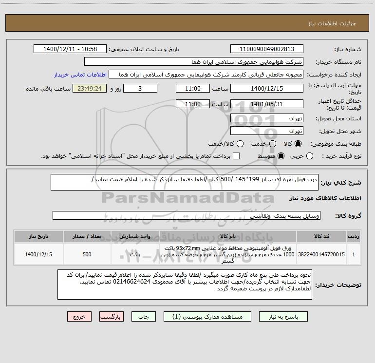 شرح کلی نیاز: درب فویل نقره ای سایز 199*145 /500 کیلو /لطفا دقیقا سایزذکر شده را اعلام قیمت نمایید/
