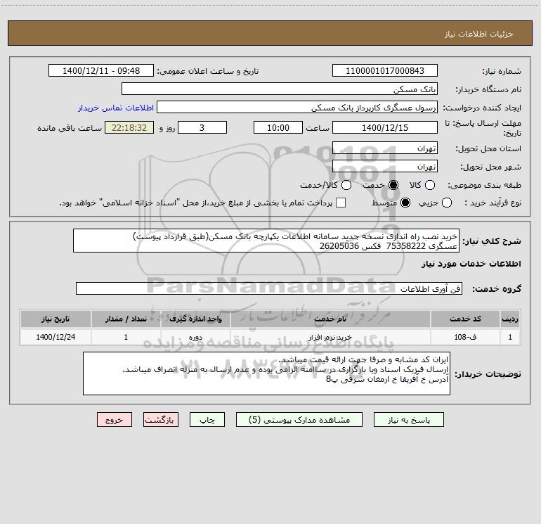شرح کلی نیاز: خرید نصب راه اندازی نسخه جدید سامانه اطلاعات یکپارچه بانک مسکن(طبق قرارداد پیوست) عسگری 75358222 فکس 26205036