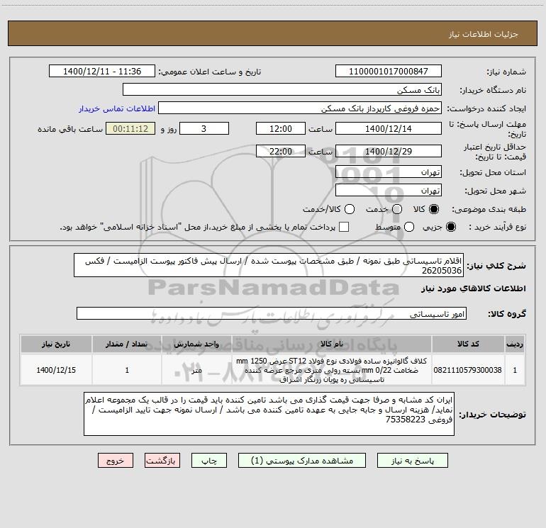شرح کلی نیاز: اقلام تاسیساتی طبق نمونه / طبق مشخصات پیوست شده / ارسال پیش فاکتور پیوست الزامیست / فکس 26205036