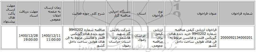مناقصه، فراخوان ارزیابی کیفی مناقصه شماره 9940202 خرید دنده های گیربکس فلندر و هانسن مربوط به فن های هوایی ساخت داخل کشور, فراخوان ارزیابی کیفی مناقصه شماره 9940202 خرید دنده های گیربکس فلندر و هانسن مربوط به فن های هوایی ساخت داخل کشور